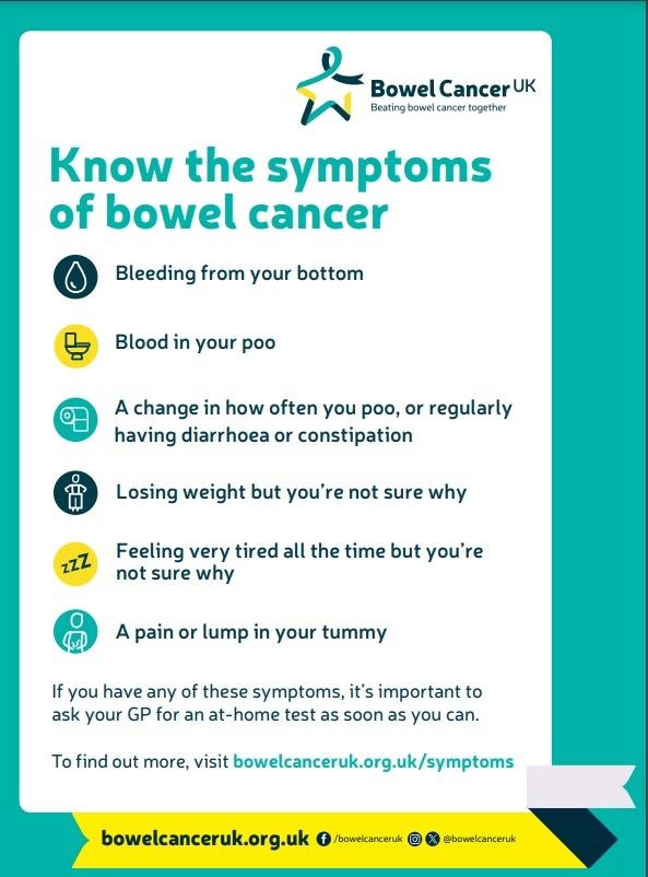 April is bowel cancer awareness month, the earlier bowel cancer is spotted, the more treatable it’s likely to be. April 1, 2024 Visit bowelcanceruk.or.uk/symptoms