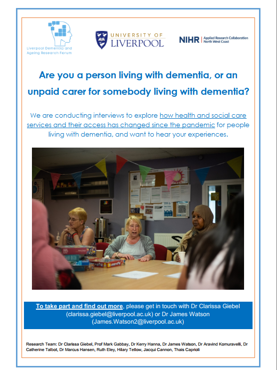 To take part and find out more, please get in touch with Dr Clarissa Giebel (clarissa.giebel@liverpool.ac.uk) or Dr James Watson (James.Watson2@liverpool.ac.uk)