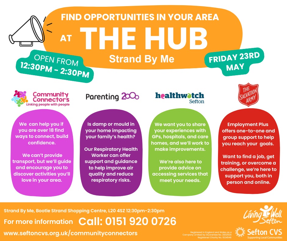 Come along to ‘The HUB at Strand by Me’ shop at Bootle Strand shopping centre, Washington Parade, Liverpool, Bootle L20 4SZ.