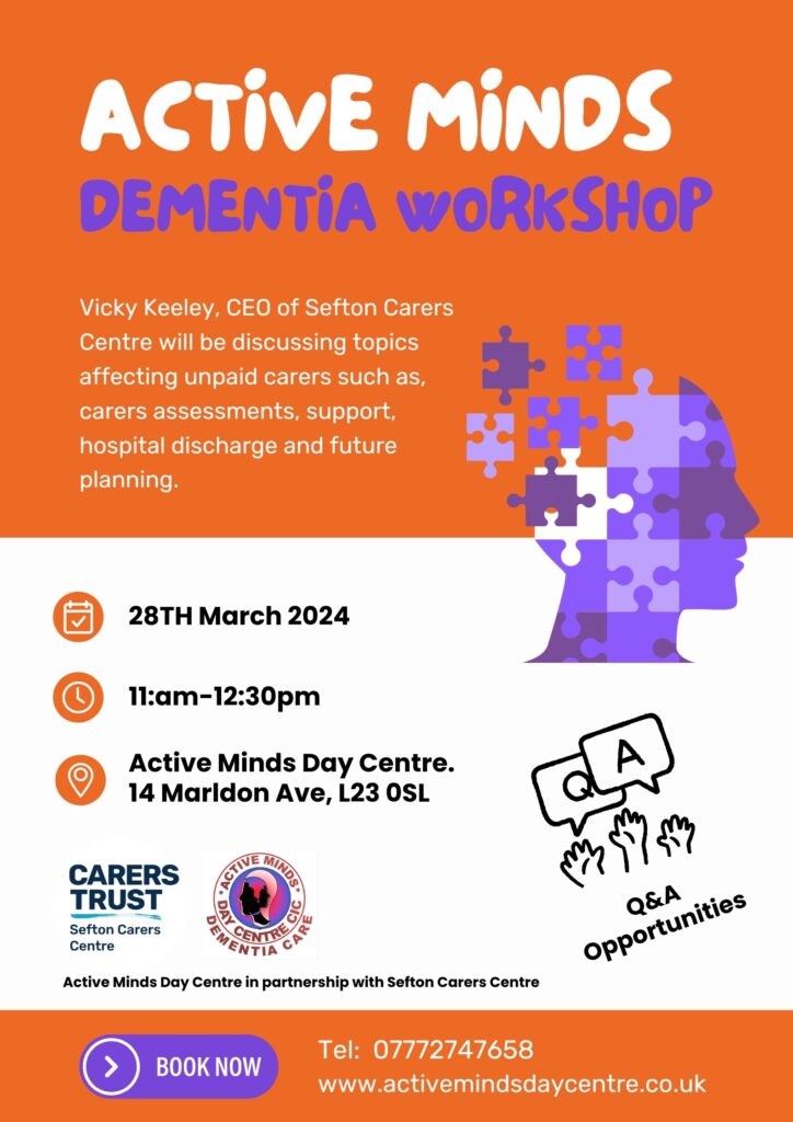 This is a free session for unpaid carers, caring for those with dementia being held at Active Minds day centre, 14 Marldon Avenue, L23 0SL.