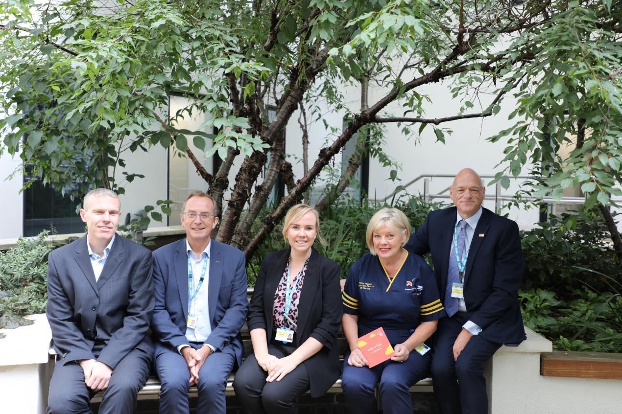 To mark the launch of the initiative at LUHFT, the first bench in the garden of the Royal Liverpool University Hospital was unveiled by the Trust’s Director of Corporate Nursing, Fiona Murphy MBE, who works in collaboration with The Good Grief Trust. She was joined by Natalie Hudson, Royal Liverpool University Hospital Executive Managing Director, David Melia, Chief Nurse at LUHFT, Dr Jim Gardner, Chief Medical Officer at LUHFT, and Stewart Crowe, Assistant Director of Health and Safety.