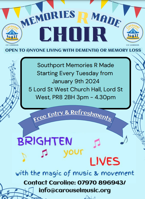 Southport ‘Memories R Made’ FREE choir will be starting every week from the 9th January 2024. This is a fabulous opportunity for people living with dementia or memory loss to experience the power of appropriate music.