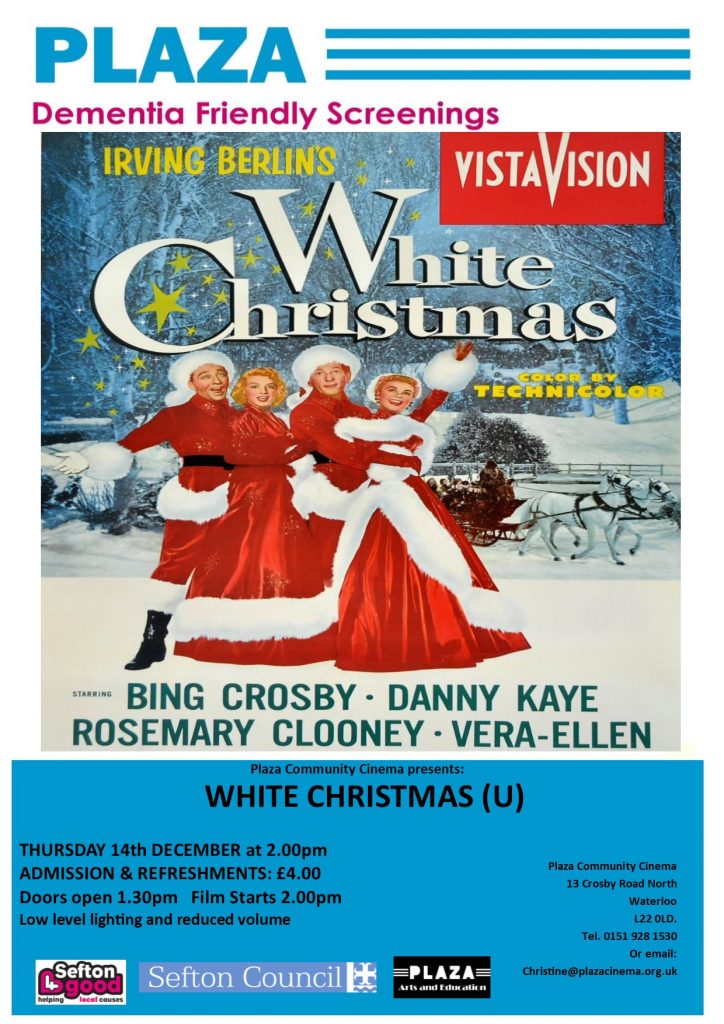 White Christmas will be screening at the Plaza cinema on Thursday 14th December at the usual time of 2.00pm. A poster for the event is below.
