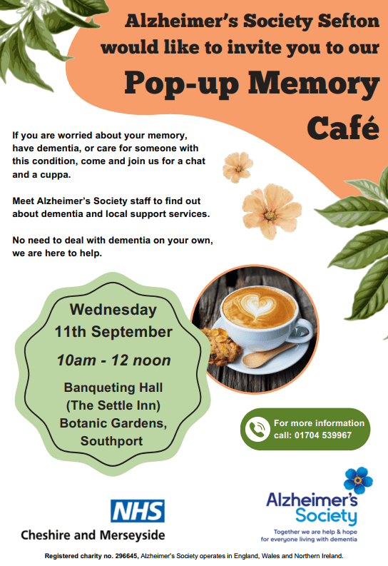 Alzheimer’s Society Sefton are having another pop-up memory café at the Botanic gardens in Southport on Wednesday 11 September in the Banqueting Hall (The Settle Inn) from 10am to 12noon.