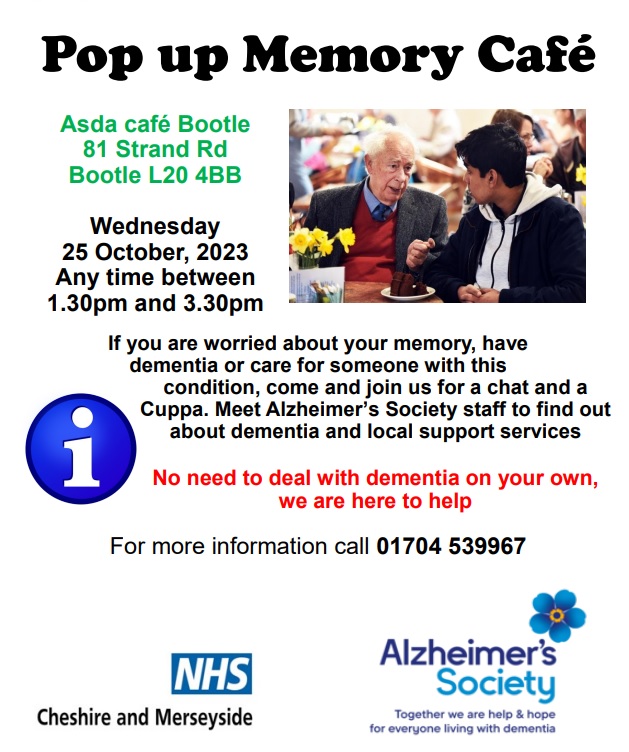 Pop up memory cafe at Asda Cafe Bootle Weds. 25 October 1.30 to 3.30pm