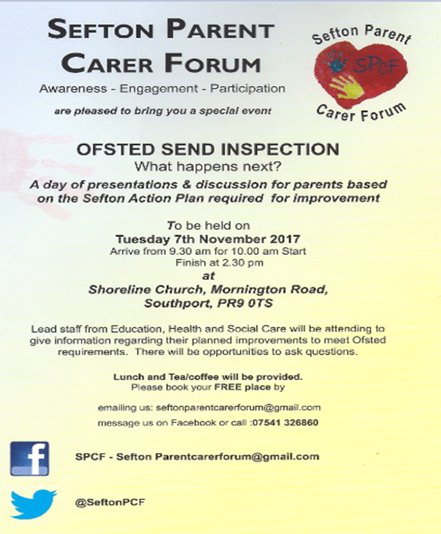 Sefton Parent Carer Forum October 31, 2017 Event on 7th November 2017, in Southport, brought to you by Sefton Parent Carer Forum.