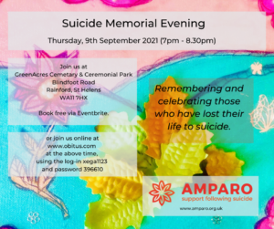 If you would like to attend online, please log-in via the link on this page: https://amparo.org.uk/suicide-memorial-evening-thursday-9-september-2021/