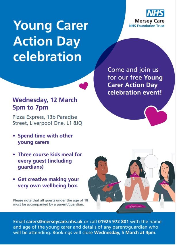 Call 01925 972 801 or email carers@merseycare.nhs.uk with the name and age of the young carer, and details of any parent/guardian who will be attending.